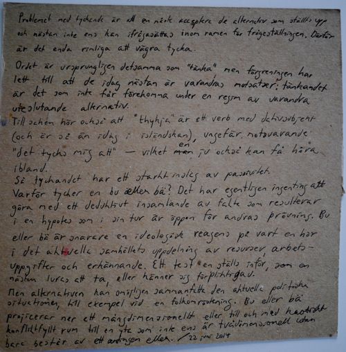 Den andra poängen som tilltalar mig mycket är tanken att tiden gör avtryck i ett skrivande som bygger på långa serier av tillfällighetstexter (snarare än enstaka koncentrerade statements). Jag har en stark förnimmelse av att tidens konkretisering är ett viktigt tema båda för Glaz Serup själv och för den poetiska praktik han skildrar.
